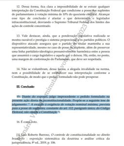 O relator, ministro Luis Barroso, reafirmou que fica clara a impossibilidade de se extrair qualquer interpretação da Constituição Federal que condicione a posse dos suplentes de parlamentares à votação mínima de 10% do quociente eleitoral. Alcançar esse tipo de conclusão é afastar o que determinou o legislador infraconstitucional, desviando o Supremo Tribunal Federal dos limites das ações de controle concentrado.